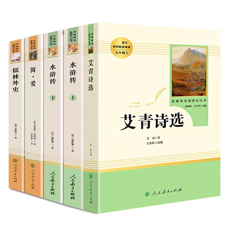 《儒林外史》《简·爱》《艾青诗选》《水浒传》是人教版九年级语文课外阅读必读书目,由人民教育出版社出版,为正版完整版原著,内容权威、编排科学,契合初三学生阅读能力与认知水平。《儒林外史》以讽刺笔法揭露科举制度弊端;《简·爱》展现女性独立与尊严的追求;《艾青诗选》收录现代诗歌经典,富有时代精神;《水浒传》描绘英雄群像,弘扬正义与反抗精神。四部作品体裁多样,思想深刻,语言优美,有助于提升学生文学素养、审美能力与人文情怀,是初中阶段不可或缺的优质阅读资源,适合上册下册系统学习,助力中考与终身成长。