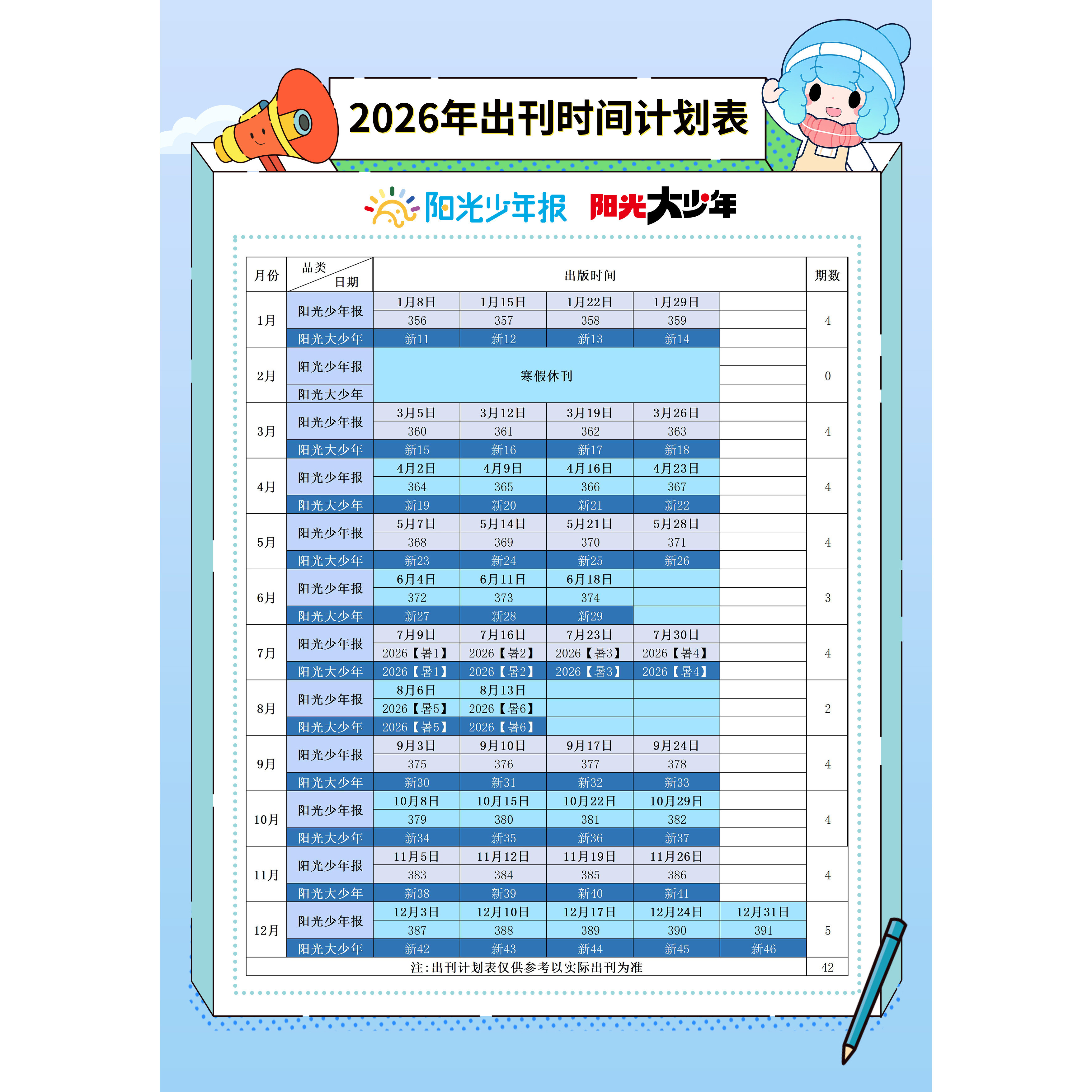 《阳光少年报》是专为青少年打造的新闻时事期刊,分为小学版(1-6年级)和初中版《阳光大少年》,2026年全年/半年订阅共约42期。内容紧扣时代脉搏,精选国内外重大新闻、社会热点及科技文化资讯,语言生动活泼,视角积极向上,契合青少年认知特点。小学版注重趣味性与启发性,初中版则加强深度与思辨性,助力学生拓宽视野、提升综合素养。作为优质的课外阅读材料,它不仅帮助孩子们了解世界,更培养其社会责任感与独立思考能力,是家长和老师信赖的成长伙伴。