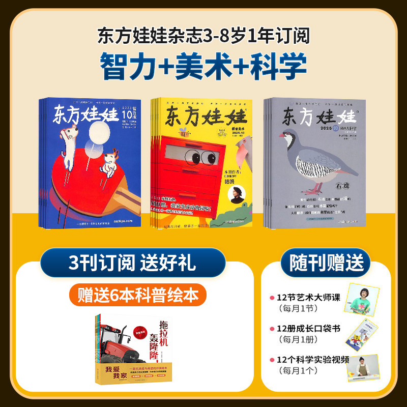 2026年1月起订的东方娃娃全年订阅组合,专为0-7岁婴幼儿精心打造,涵盖《智力版》《绘本版》《科学版》《数学版》《美术版》《东方宝宝》及《卜卜刊》七大刊物,内容科学分级、趣味性强。每期融合故事、游戏、认知与艺术启蒙,助力语言发展、逻辑思维与创造力培养。绘本精选国内外优质作品,科学数学贴近生活,美术手工激发想象力,《卜卜刊》则专为低幼宝宝设计,安全耐撕、互动性强。全年24期按月配送,陪伴孩子成长每一步,是家庭早期教育的理想之选,让阅读成为快乐习惯。