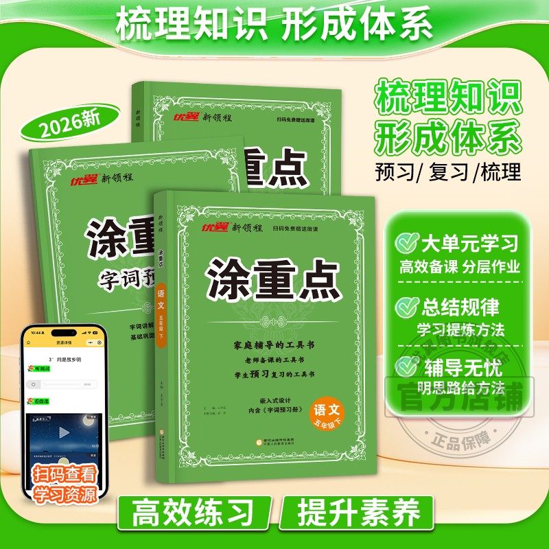 《新领程涂重点2026新版课堂学霸随堂笔记》是一套专为小学1-6年级学生设计的人教版语文同步辅导资料,涵盖上下册全12册教材内容。本书紧扣新课标要求,与课本完全同步,系统梳理每课重点字词、句段解析、课文主旨及写作技巧,帮助学生高效预习、巩固课堂知识。采用“涂重点”式编排,突出考点与难点,搭配典型例题和学法指导,提升阅读理解与表达能力。内容精炼实用,图文并茂,适合学生自主学习与家长辅导,是提升语文成绩、培养学习习惯的得力助手,助力小学生夯实基础、领跑课堂。