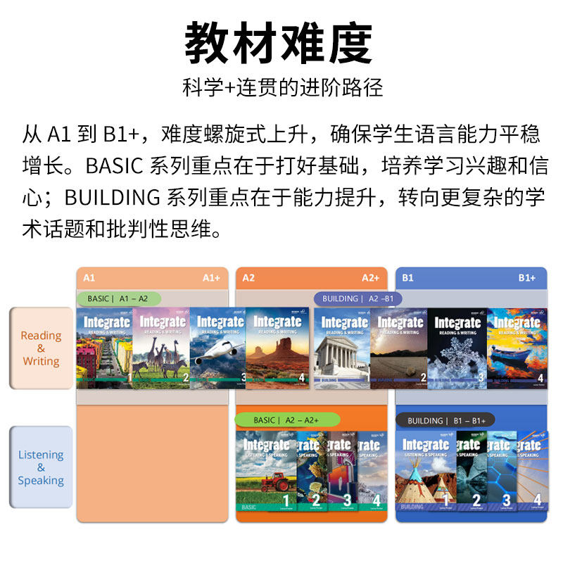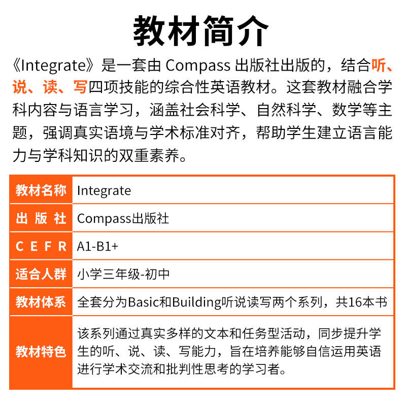 《Integrate》是一套原版进口、专为小学至初中阶段学生设计的综合英语教材,全面覆盖听、说、读、写四项核心技能,科学对标剑桥英语KET/PET等级考试要求。教材内容生动有趣,融合真实语境与跨文化元素,通过任务型教学和项目式学习激发学生兴趣,提升语言实际运用能力。每单元围绕主题展开,循序渐进地培养词汇、语法与交际能力,配套丰富的练习与测评体系,助力学生系统备考KET/PET。适用于国际学校、双语课堂及课外培训,是提升青少年英语综合素养的优质选择。
