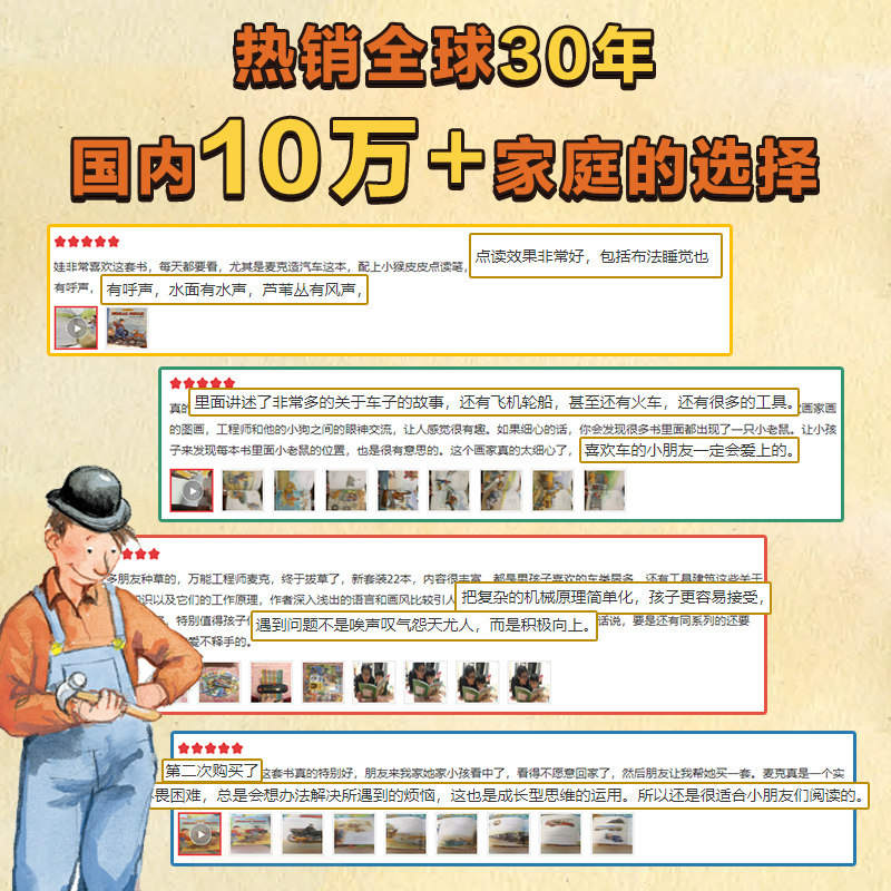 【点读版】万能工程师麦克20册点读书,专为3-8岁儿童打造,是一套融合科普知识与趣味故事的优质绘本。书中通过工程师麦克的生动冒险,带领孩子认识汽车、飞机、挖掘机、火车等工程车辆的工作原理与用途,激发探索欲与创造力。每册配有精美插图和简单文字,支持点读功能,发音标准,帮助孩子自主阅读,提升语言能力。结合小鸡球球点读笔使用,互动性强,既是睡前故事好伴侣,也是动手认知的启蒙工具。内容丰富、寓教于乐,让孩子在快乐中学习机械奥秘,培养科学思维与动手能力,是家庭必备的科普图画书。