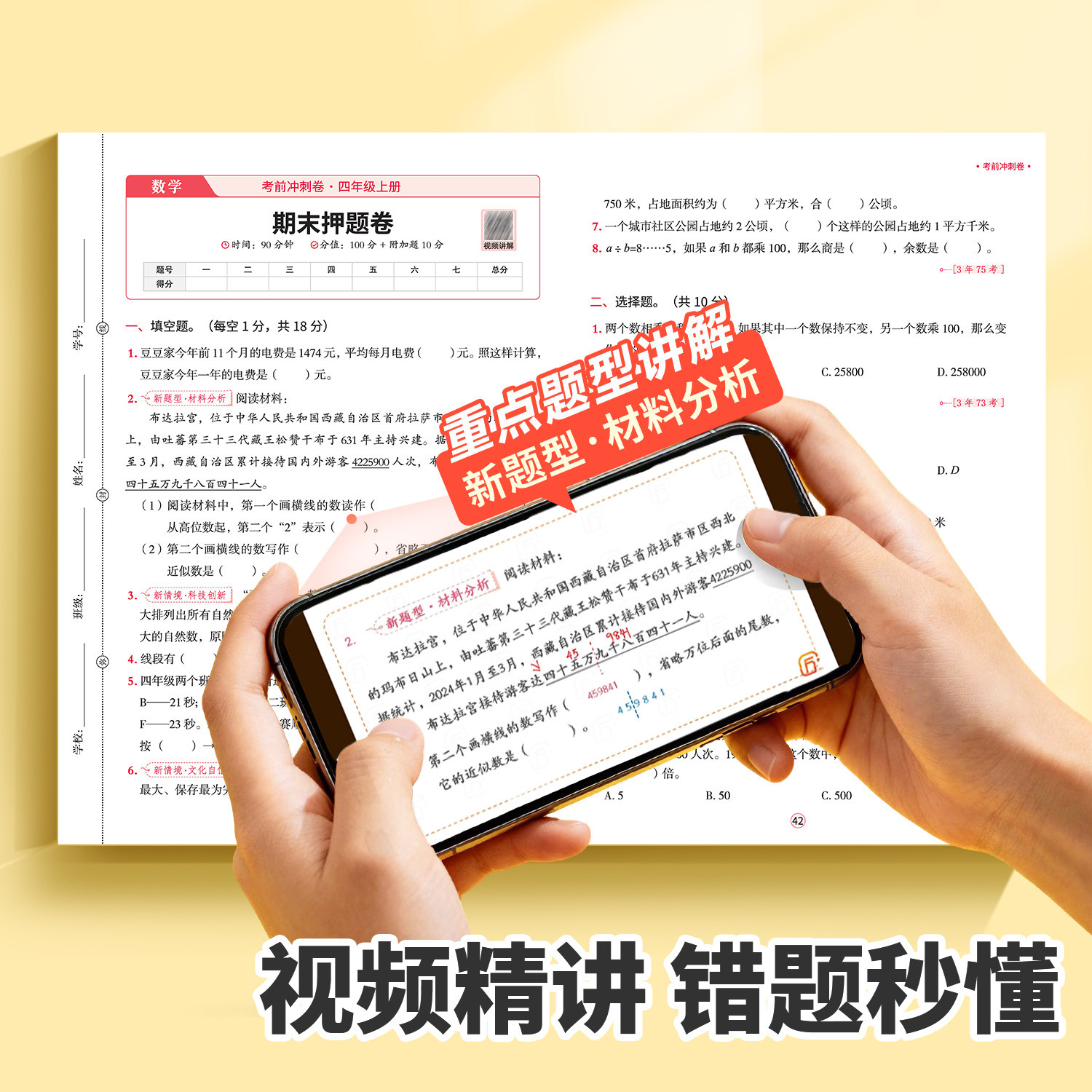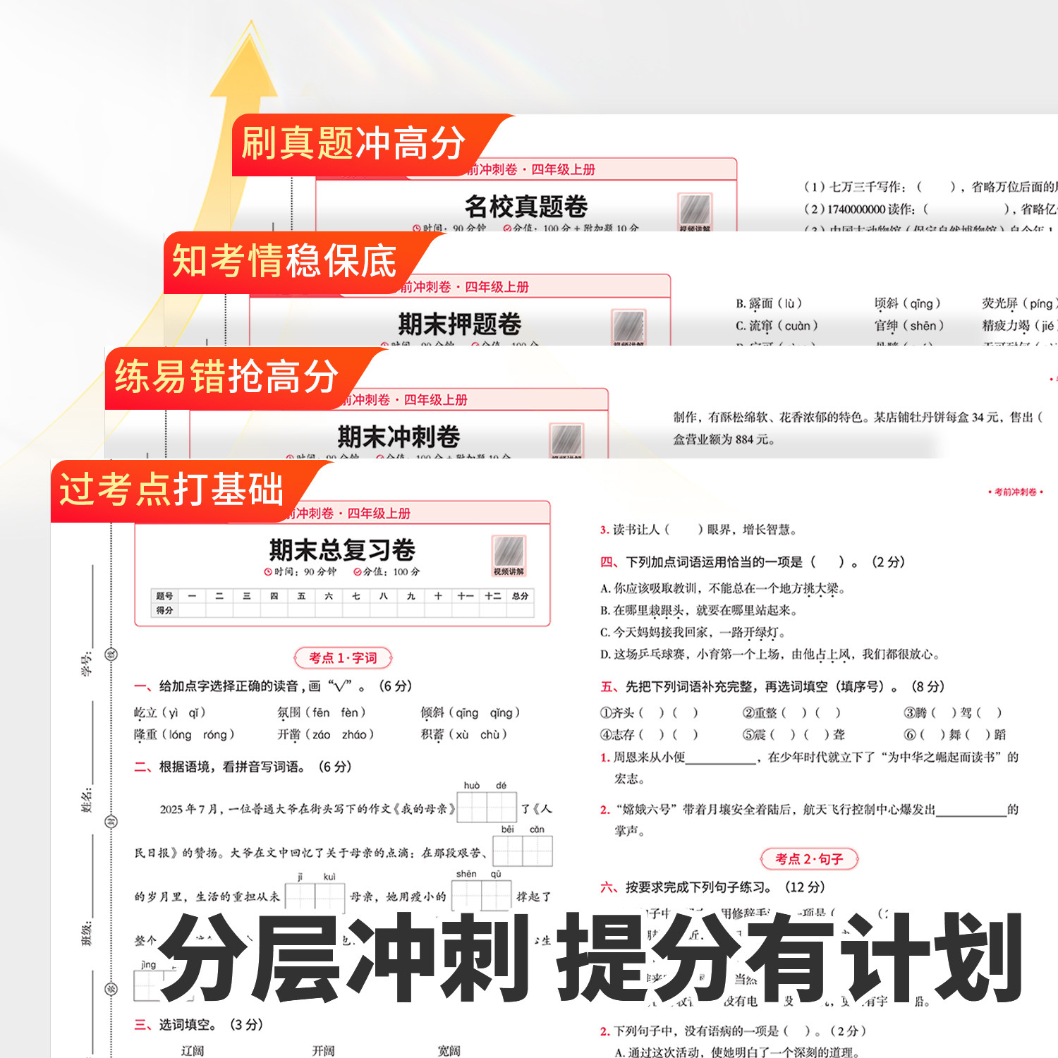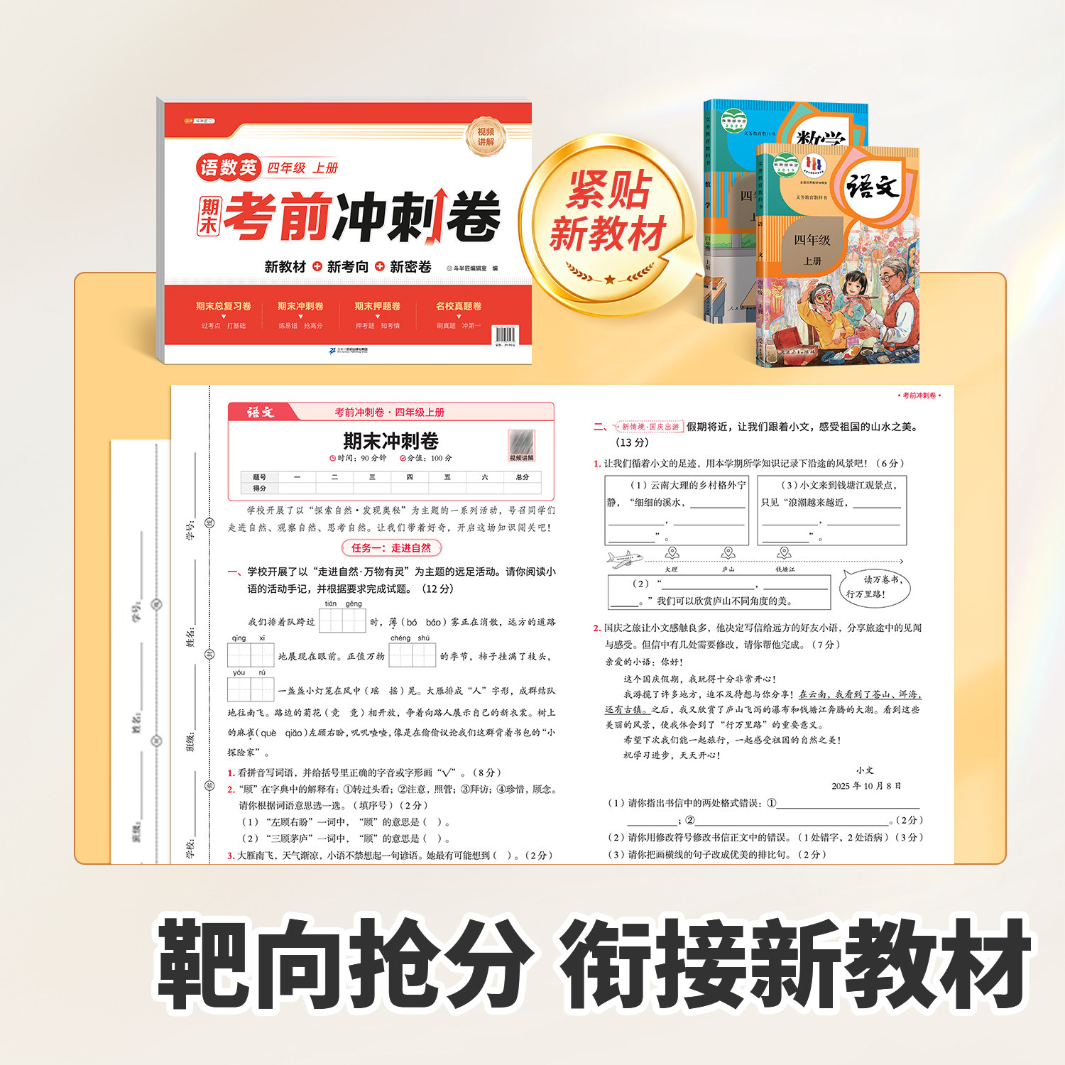 2026年适用四年级上册试卷全套(人教版)涵盖语文、数学、英语三科,专为小学四年级学生设计,紧扣教材单元知识点,包含单元测试卷、同步练习册、期末冲刺100分模拟卷等丰富题型。试卷内容科学编排,难度适中,注重基础巩固与能力提升,帮助学生系统复习、查漏补缺。每套试卷均配有详细答案解析,便于家长辅导和自测使用。适用于日常练习、阶段检测和考前冲刺,是提升学业成绩、备战期末考试的理想教辅资料,助力孩子在关键学年稳步提高,轻松取得优异成绩。