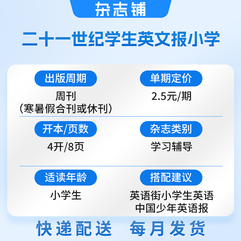 《二十一世纪学生英文报》小学版是专为小学生打造的英语学习报刊,内容生动有趣,涵盖时事新闻、文化知识、科学探索与校园生活,语言地道、难度适中,助力提升英语阅读与综合素养。2026年1月起订,全年共40期,每月定期送达,持续激发孩子英语学习兴趣。杂志铺提供包邮服务,订阅便捷省心。报纸融合教育性与趣味性,配套音频与互动练习,帮助孩子在轻松氛围中拓展视野、积累词汇、了解世界。是小学生课外英语学习、培养国际视野的理想读物,适合小学各年级学生订阅使用。
