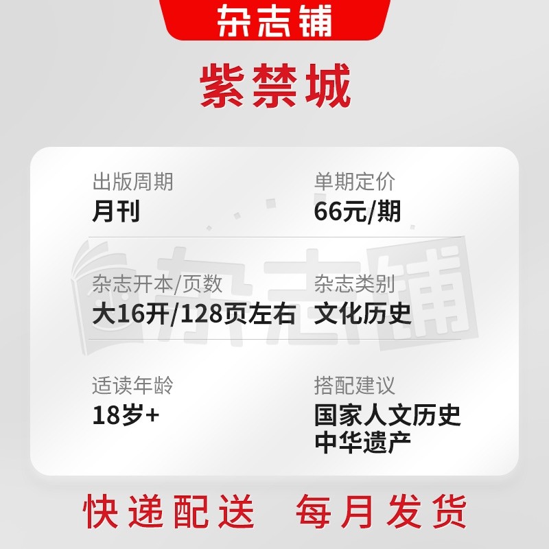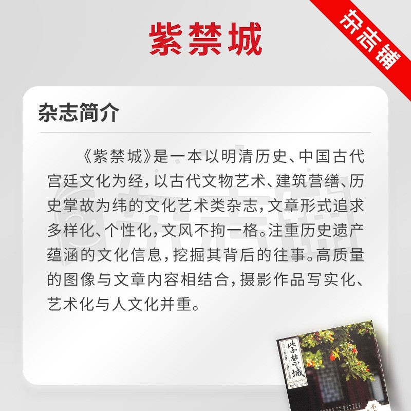 《紫禁城》杂志艺术收藏期刊,2026年1月起订,全年共12期,现由杂志铺提供全年订阅服务,全国包邮。该刊以故宫文化为核心,深度解读中华传统艺术、文物典藏与宫廷历史,内容涵盖书画、陶瓷、玉器、建筑等多个领域,兼具学术性与观赏性。每期特邀专家学者撰稿,配以高清大图与精美排版,是艺术爱好者、收藏者及文化研究者的理想读物。订阅用户可享受按期直送、包装完好、售后无忧等贴心服务。通过杂志铺订阅,不仅价格优惠,还可随时查询物流与续订信息,轻松开启一年的文化之旅。品味紫禁风华,从一本杂志开始。