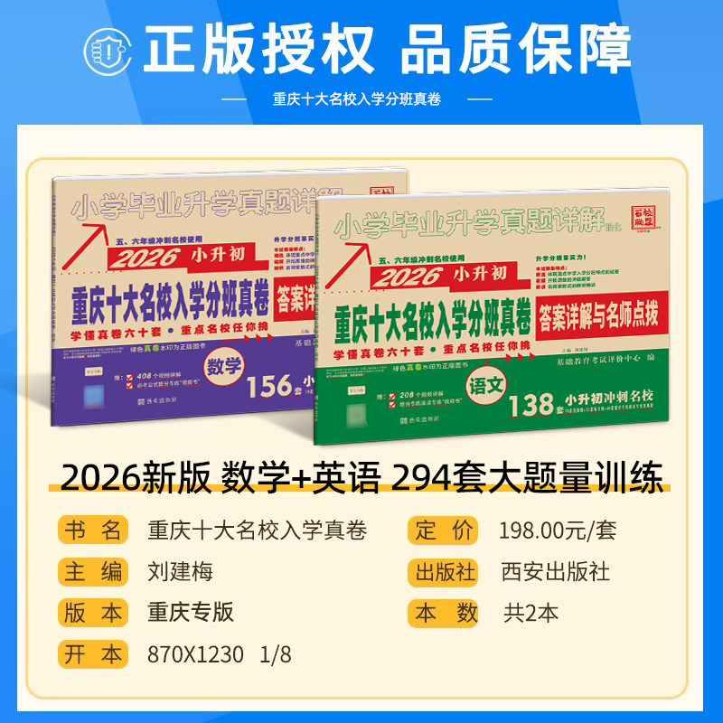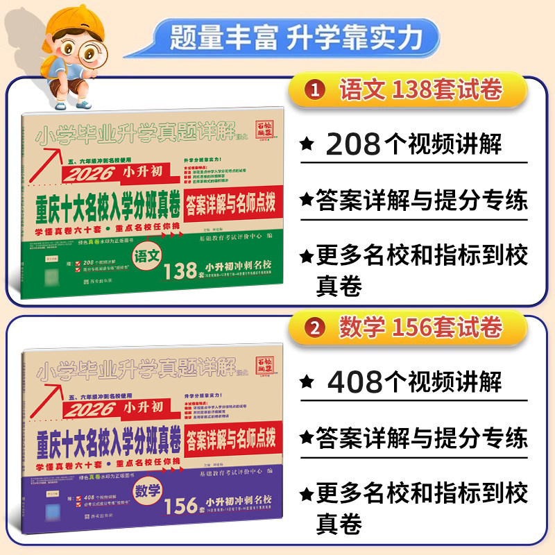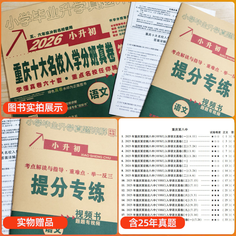 《2026年重庆十大名校招生真卷》是一套专为小学五六年级学生备战小升初及“七龙珠”等名校分班考试打造的全科复习资料,涵盖语文、数学、英语三科真题与模拟题。精选重庆顶尖中学历年招生真题,紧扣最新考纲,题型全面,难度贴近实战。数学部分融入奥数思维训练,强化逻辑与解题技巧;英语注重词汇、语法与阅读综合能力提升;语文突出基础知识与作文表达。全套资料系统梳理考点,配套详细解析,帮助学生高效查漏补缺,是小升初冲刺名校、备战分班考试的必备刷题宝典。