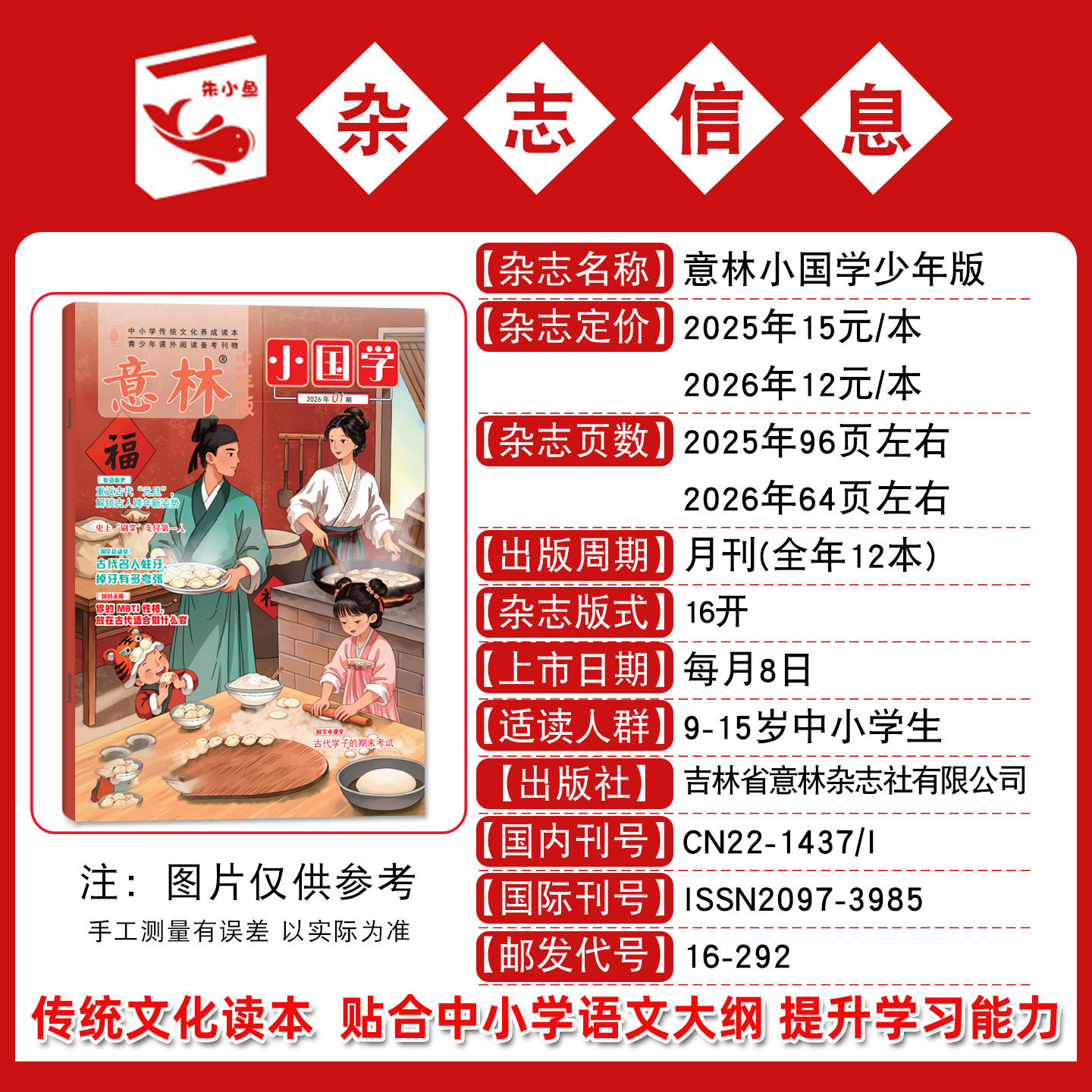 《意林小国学少年版》2026年1月新刊及2025年1-12月全年/半年订阅火热进行中!专为7-15岁小学生与初中生打造,融合国学经典、诗词赏析、历史故事与科学知识,内容生动有趣,寓教于乐。每期精选优质作文素材,助力语文学习与写作提升。2024年过刊同步供应,性价比高,适合积累阅读。杂志注重传统文化传承与科学素养培养,语言通俗,图文并茂,是青少年拓展视野、提升综合素养的理想读物。无论是日常阅读还是备考积累,都能让孩子在轻松阅读中收获成长。