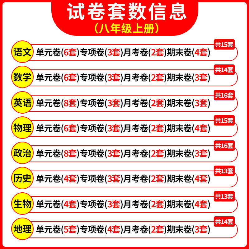 《初二八年级上册全套试卷(人教版)》是一套专为八年级学生设计的同步测评练习册,涵盖语文、数学、英语、物理、政治、历史、地理、生物八大学科。试卷紧扣教材知识点,包含单元测试卷、期中、期末综合卷及专项训练,题型多样,难度适中,注重基础巩固与能力提升。全书依据新课标要求编写,贴合教学进度,帮助学生及时检测学习效果,查漏补缺。同时配备详细解析,便于学生自主复习与教师讲评。是八年级学生夯实基础、备战考试的高效学习工具,助力全面提升学科素养与应试能力。