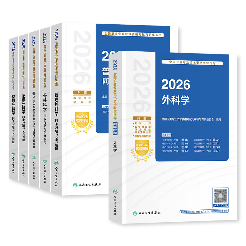 2026年人卫版《外科学主治医师考试指导》是官方权威教材,专为报考中级职称的外科主治医师考生编写,涵盖整形外科、普通外科、泌尿外科、骨外科等亚专业内容。本书紧扣最新考试大纲,系统梳理核心知识点,并配有同步习题强化训练,帮助考生夯实基础、查漏补缺。内容结构清晰,重点突出,融合临床实践与考试要点,适合不同层次考生复习使用。搭配2025年模拟试卷及历年真题,可全面检验学习效果,提升应试能力。作为国家医学考试中心推荐用书,是备战2026年外科学主治医师考试的必备资料,助力考生高效通关,顺利取得中级职称资格。