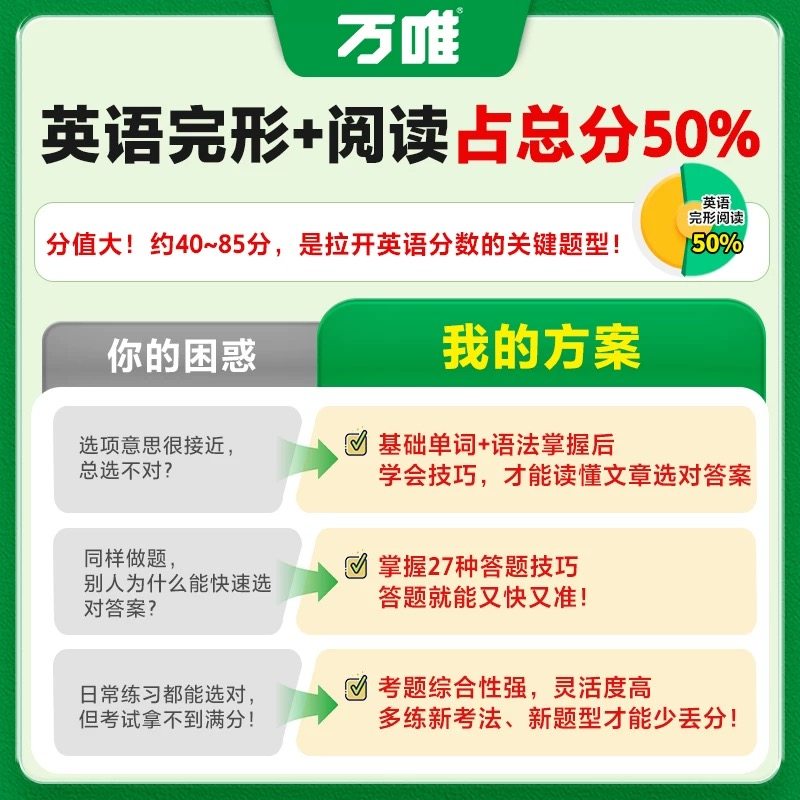 《2026万唯中考英语完形填空与阅读理解基础题提升版(全国版)》专为七年级至九年级学生设计,涵盖初一上下册内容,系统强化完形填空与阅读理解两大核心题型。本书紧扣新课标及中考考纲,精选典型基础题与进阶训练,题型全面、难度分层,帮助学生夯实语言基础,提升解题能力。搭配万唯专业教研团队研发的解题策略与技巧点拨,引导学生掌握阅读方法与答题逻辑。全国通用版本,适配各地教材,是初中生夯实英语基础、备战中考的高效专项训练用书。