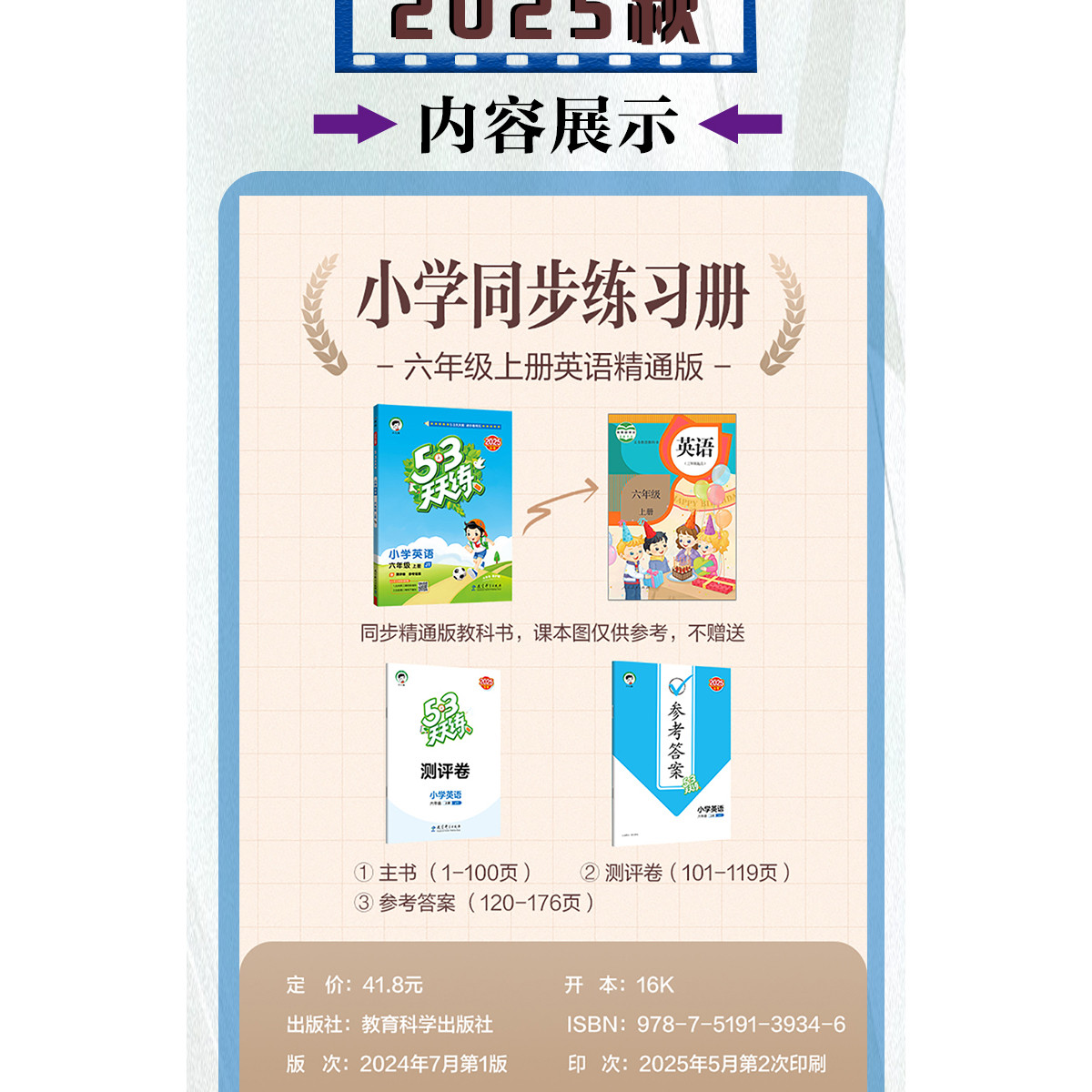 2025秋版《53天天练》是一套与小学教材同步的电子版同步训练丛书,涵盖数学(西师版)、语文、英语(人教版、外研版)等多个学科,适用于一至六年级上下册。由知名教辅品牌“曲一线”精心编写,紧扣新课标要求,题型丰富、梯度合理,注重基础知识巩固与能力拓展。每课一练,日日精进,帮助学生夯实基础、提升解题能力。电子版形式便于打印、下载和在线使用,适合家庭辅导与课堂练习,是小学生日常学习与复习的高效辅助工具,助力学生稳步提升学业成绩。