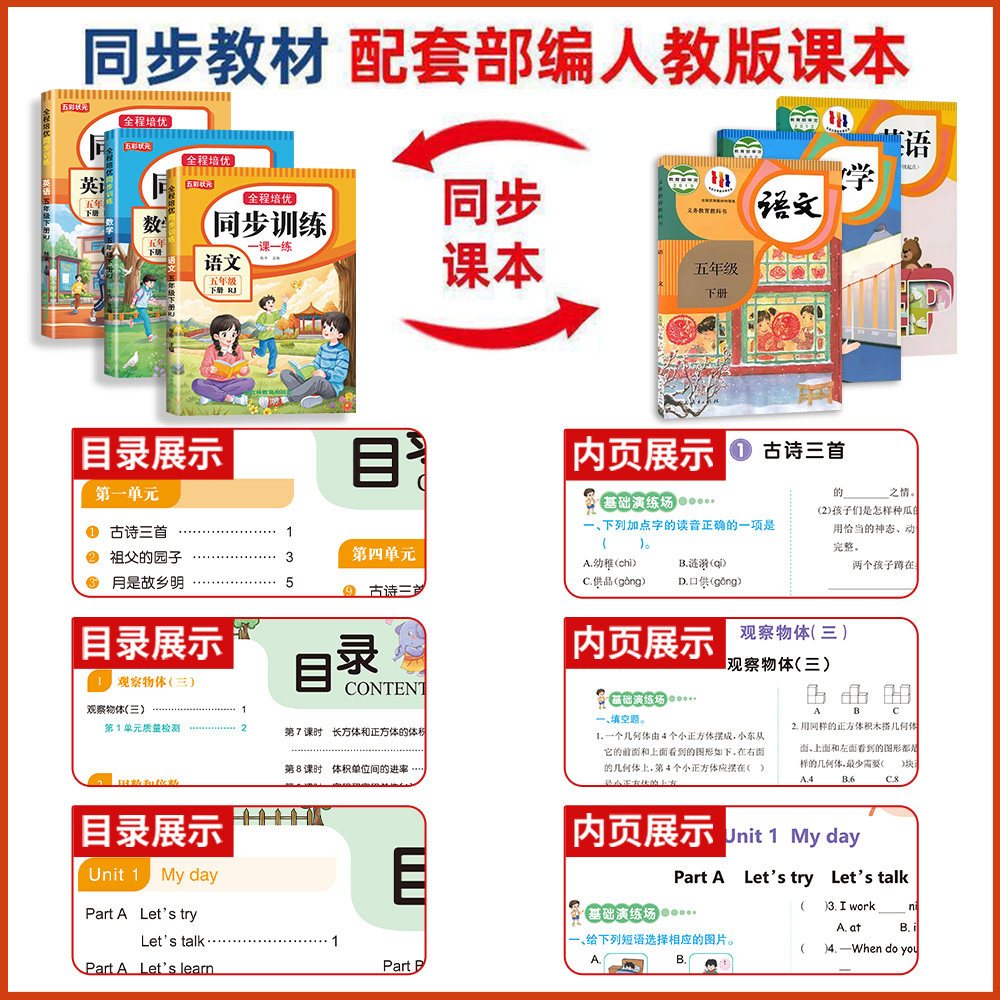 天猫五年级下册同步练习册人教版2026新版语数英同步训练全套语文数学英语上下册一课一练教材同步练习题小学课堂作业5年级同步测试卷